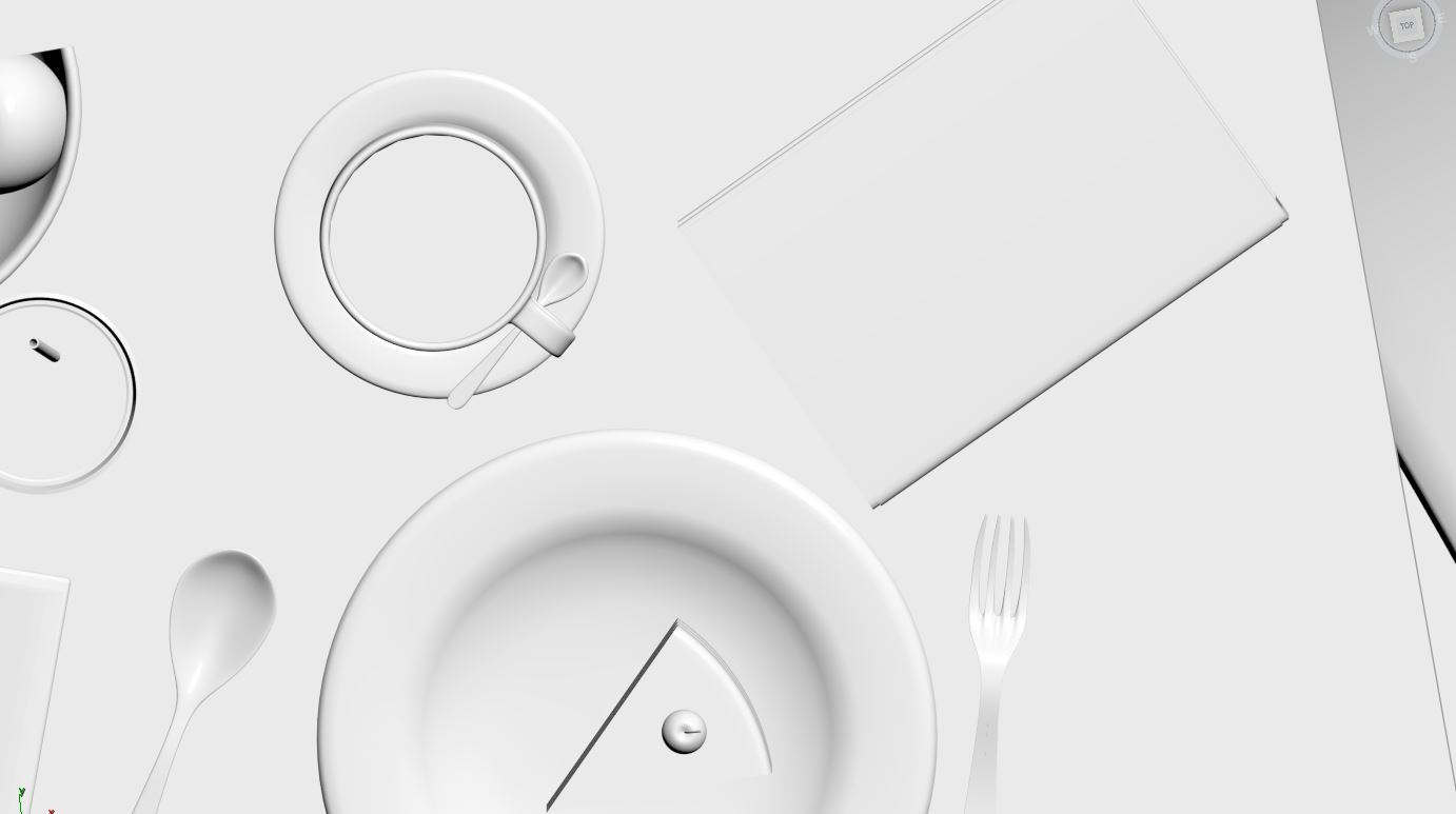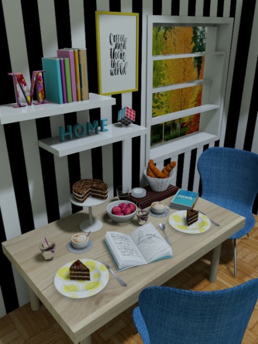 3D modeling of my idea for a perfect breakfast. Book, coffee and cake.